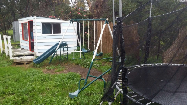 On the land is a shed, a sand pit, a cubby house, a trampoline and a swing set.